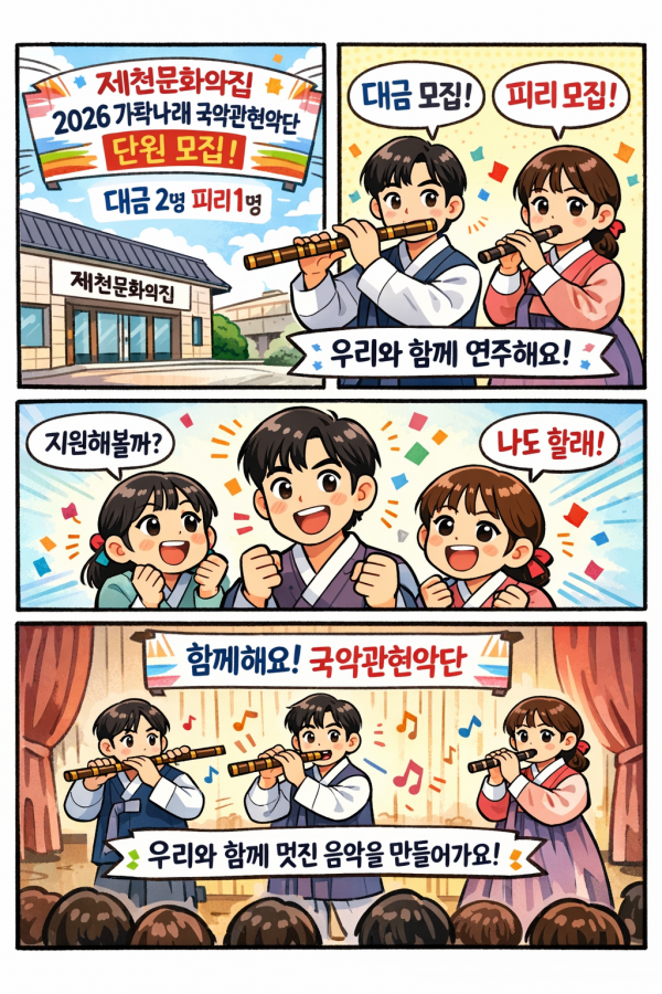 전통 국악의 아름다움을 함께 만들어갈 2026 제천청소년문화의집 청소년국악관혁악단 ‘가락나래’ 신규 단원을 모집합니다.