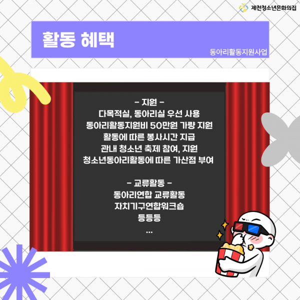 청소년이 스스로 기획하고 도전하며 성장하는 청소년 주도 동아리 활동을 지원하고자 [제천시동아리활동지원사업] 에 참여할 동아리를 찾습니다