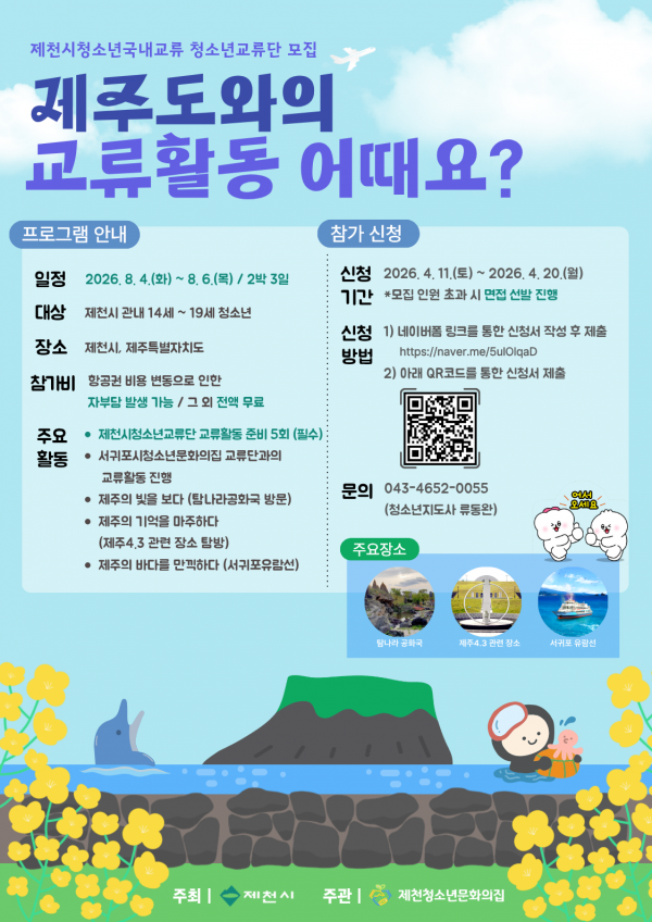 제천시 청소년들의 다양한 경험과 교류를 통한 성장을 지원하고자 [2026년 제천시 청소년 국내교류 청소년교류단]을 다음과 같이 모집하오니